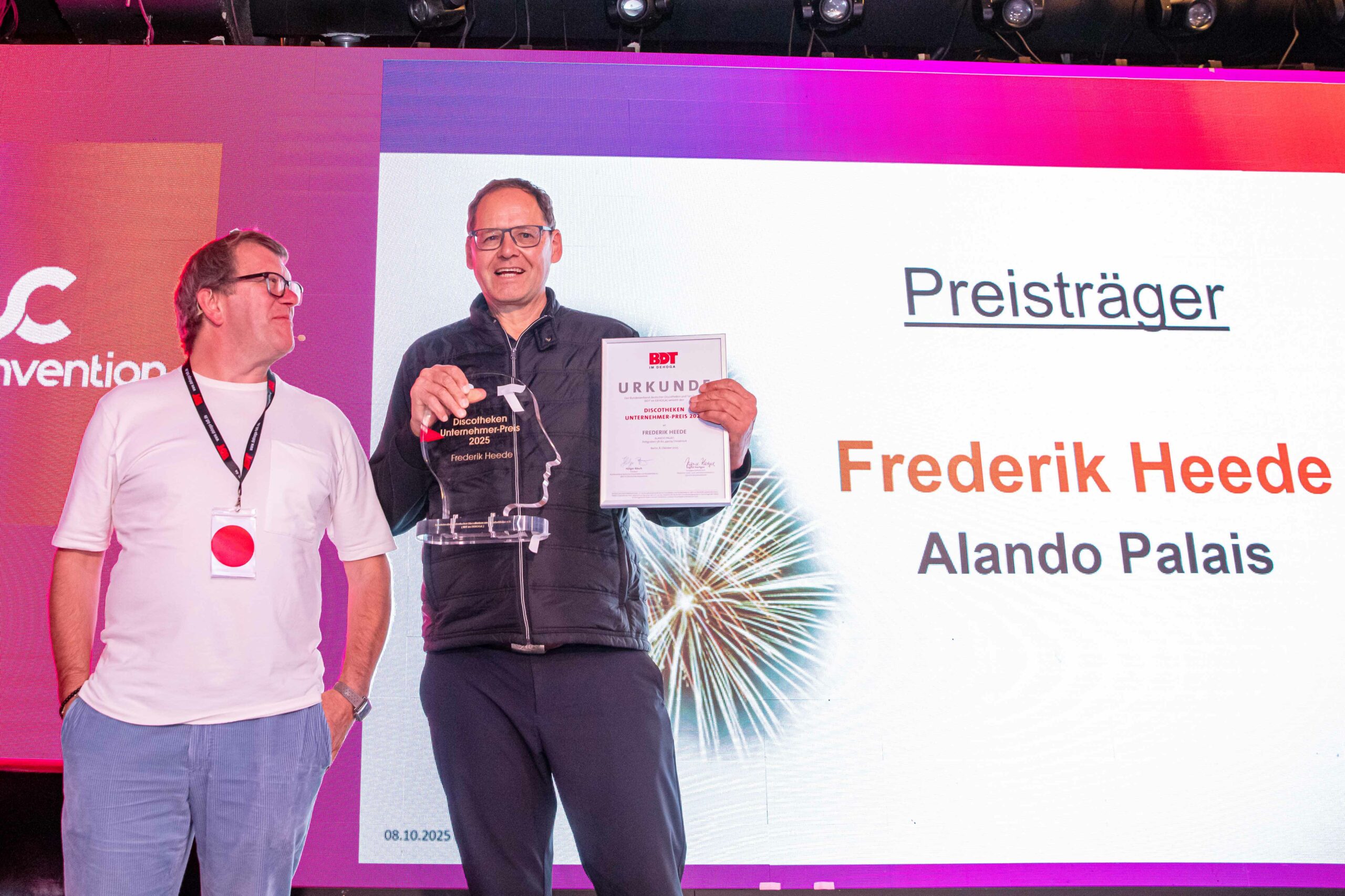 Der zweite Tag stand ganz im Zeichen des Austauschs. Im Club-Ambiente des Balcony Berlin / THE CLOUD diskutierten Branchenprofis, Betreiber und Partner über aktuelle Herausforderungen und Chancen der Szene. Ein besonderer Moment war der Besuch von Frau Jana Schimke, der zukünftigen Hauptgeschäftsführerin des DEHOGA Bundesverbands – ein starkes Signal an die Nachtgastronomie. Der Discotheken-Unternehmerpreis 2025 ging in diesem Jahr an Frederik Heede vom Alando Palais. Die Auszeichnung würdigt seinen unternehmerischen Weitblick, sein kontinuierliches Engagement und seine konsequente Arbeit an einer klaren Vision.
